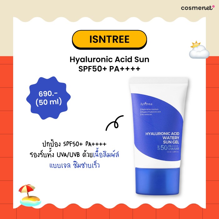 กันแดดที่กำลังมาแรงในแวดวงพส.เกาหลี ISNTREE Hyaluronic Acid Watery Sun Gel ตัวนี้เป็นกันแดดแบบ Chemical ที่ให้การปกป้อง SPF50+ PA++++ รองรับทั้ง UVA/UVB ที่หยิบเอา Hyaluronic Acid 8 ชนิด กับ Ceramide ใส่เข้าไว้ด้วยกัน ทำให้ผิวได้รับความชุ่มชื้นระดับลึก พร้อมด้วย Astaxanthin, Centella Asiatica Extract และ Fig Fruit Extract ช่วยปลอบประโลมผิว และให้ความยืดหยุ่นแก่ผิว มอบผิวเนียนนุ่ม แลดูกระจ่างใส ที่มาในเนื้อสัมผัสแบบเจล บางเบา ซึมซาบเร็ว โดยไม่ทำให้ผิวเกิดคราบหรือเป็นขุย สามารถใช้เป็นเบสเมคอัพได้ หรือใช้ก่อนแต่งหน้าก็เริ่ด ๆ เลยแหละ