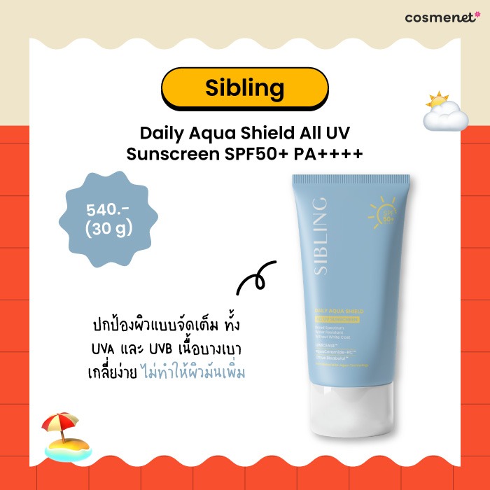 ปิดท้ายด้วยกันแดดแบรนด์ไทยอย่าง Sibling Daily Aqua Shield All UV Sunscreen แม้จะเน้นความเป็นมิตรกับผิว แต่การปกป้องก็จัดเต็ม รองรับทั้ง UVA และ UVB และยังใส่ส่วนผสมบำรุงมาค่อนข้างดี ทั้งเซราไมด์จากข้าวญี่ปุ่น เข้ามาช่วยเติมน้ำให้ผิวดูอิ่มฟูขึ้น ผสานกับต้นอ่อนทานตะวัน ที่ช่วยปลอบประโลมผิวให้ดูสงบหลังเจอแดด โดยมีเนื้อครีมสุดเบาสบายผิว เกลี่ยง่าย ไม่ทิ้งคราบ ไม่เป็นขุย และไม่ทำให้หน้ามันเพิ่ม ทาแล้วให้ฟีลผิวเรียบเนียนสวยแบบไม่ต้องพยายามเลยปังมาก