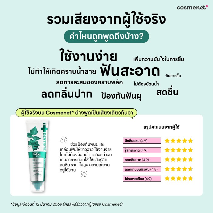สรุปรีวิว Dentiste’ Max จากผู้ใช้จริง 91 คน คะแนนเฉลี่ย 4.9 คะแนน