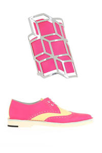 รองเท้าหนังสานสุดล้ำจินตนาการ มีให้เลือกสี่รุ่นคือส้นเรียบ, ส้นเตี้ย, ส้นสูง และส้นตึก เป็นบทหลอมรวมระหว่างการใช้เนื้อสัมผัสหลากแบบกับหนังหลากชนิด และสีสันที่ขัดแย้ง